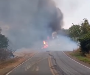 Na manhã deste sábado (19), uma carreta carregada com caroço de algodão pegou fogo enquanto trafegava pela BR-030, no trecho do município de Caetité, no sudoeste da Bahia. O incêndio causou a interdição total da rodovia nos dois sentidos.
